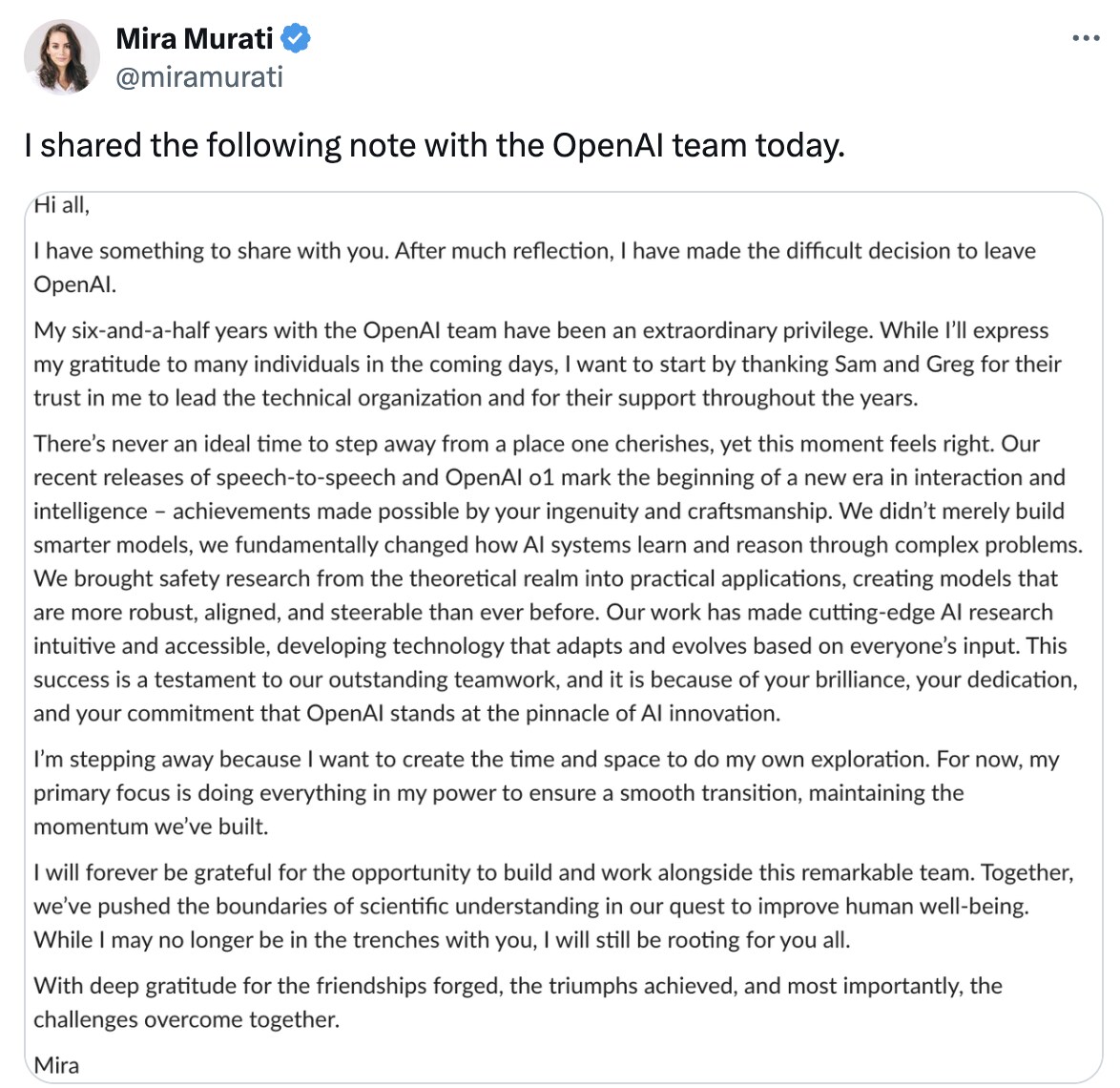 "It’s hard to overstate how much Mira has meant to OpenAI, our mission, and to us all personally."